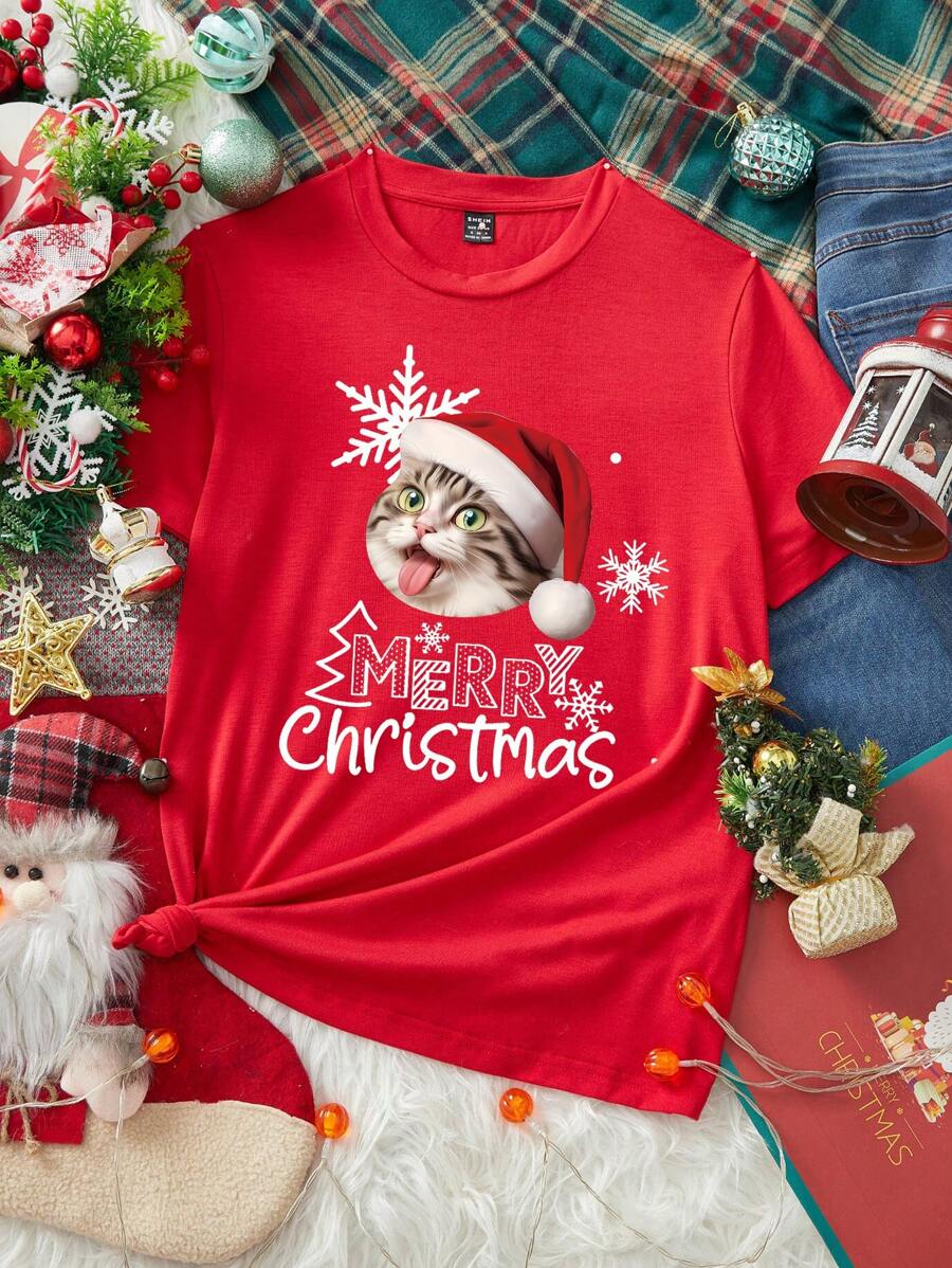T-Shirt a Maniche Corte Rossa da Donna - Stampa Gatto di Natale e Girocollo