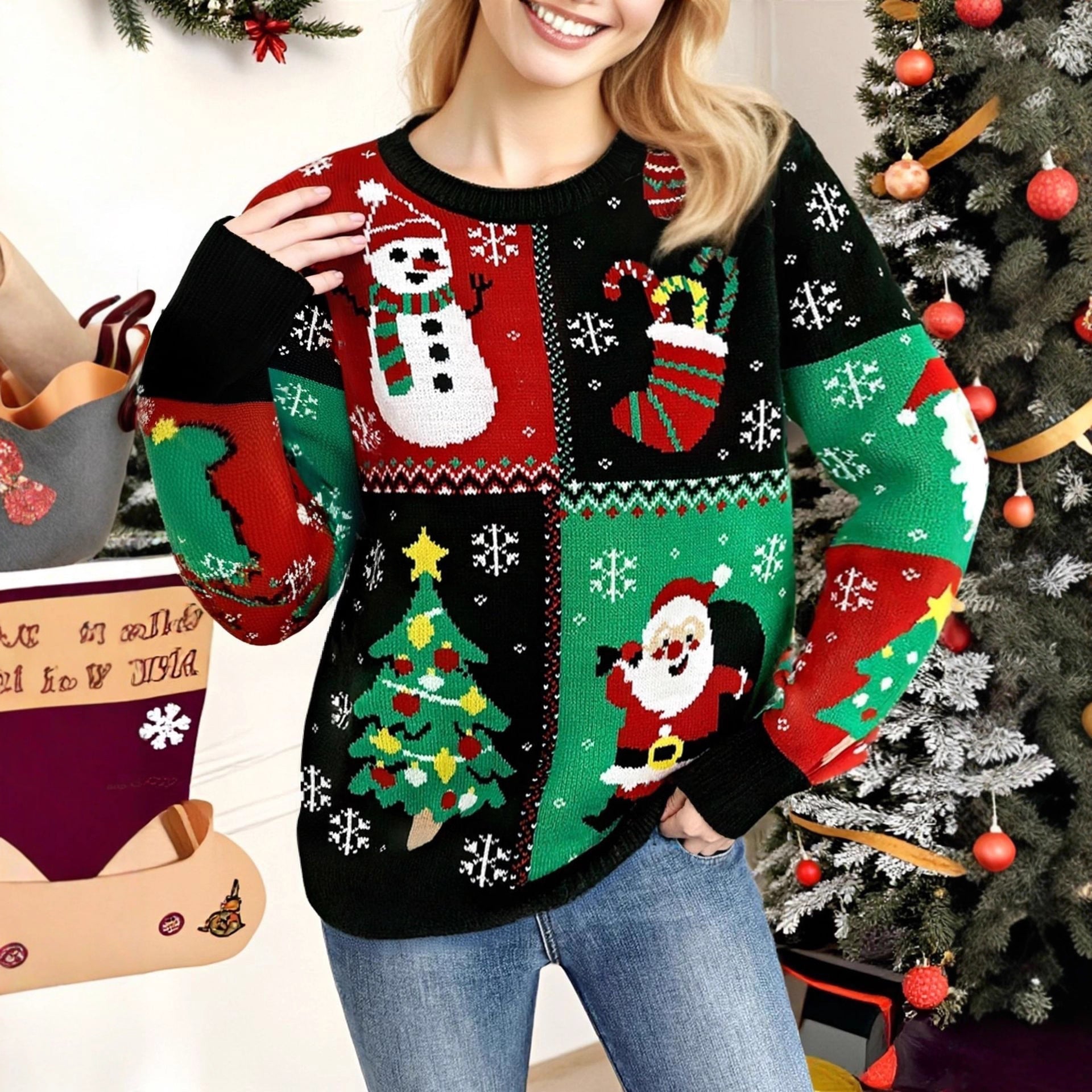 Fai una Dichiarazione Divertente e Festiva con questo Maglione a Maniche Lunghe Nero da Donna. Mostra il tuo spirito natalizio con il nostro audace Maglione a Maniche Lunghe Nero da Donna. Questo capo unico si distingue dai design tradizionali, presentando un Motivo a Maglia Natalizio Multi-Pannello Festivo che include un pupazzo di neve divertente e un motivo a albero di Natale. Lo sfondo Nero offre una Base Festiva Accattivante per i pannelli colorati e stravaganti. Con il suo classico Girocollo e la vestibilità accogliente, questo maglione offre un Abbigliamento Festivo Umoristico e confortevole, perfetto per qualsiasi evento casual.
