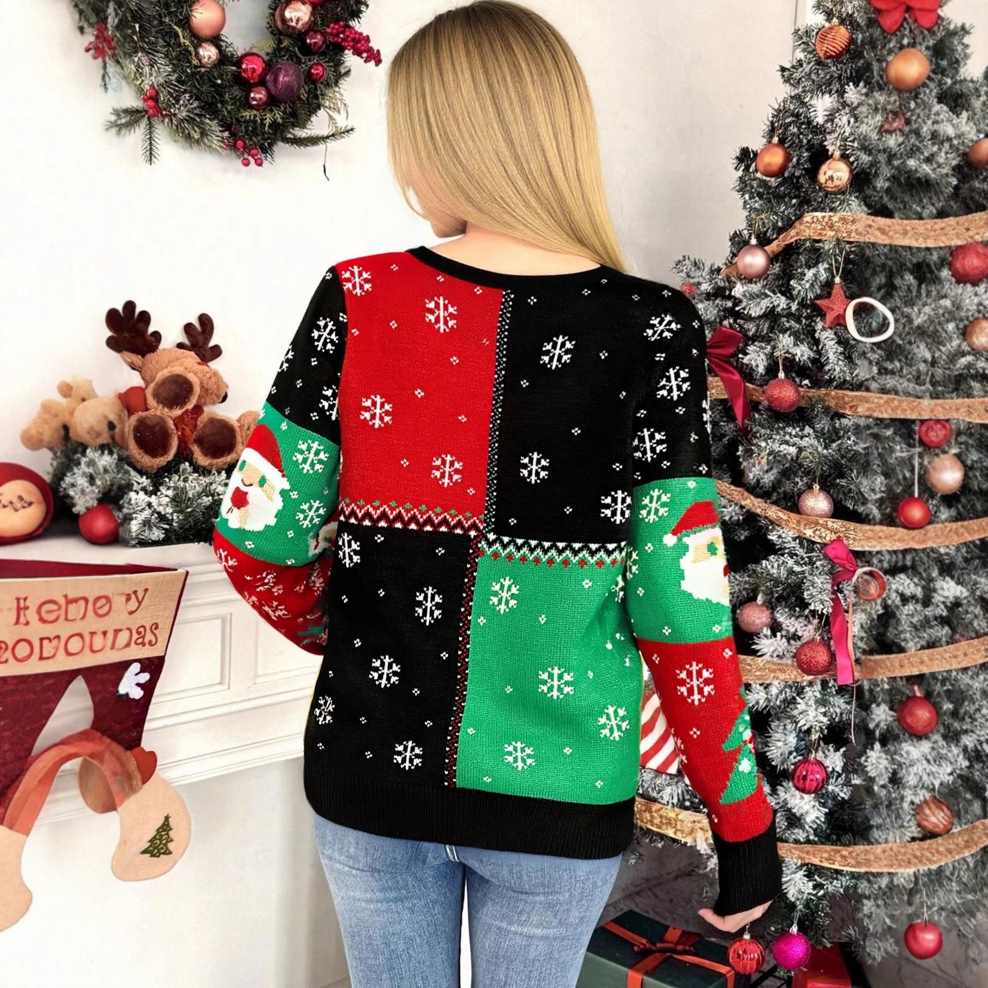 - Look ad Alto Contrasto: Il colore Nero funge da Base Festiva Accattivante che fa risaltare i luminosi motivi a maglia natalizi.