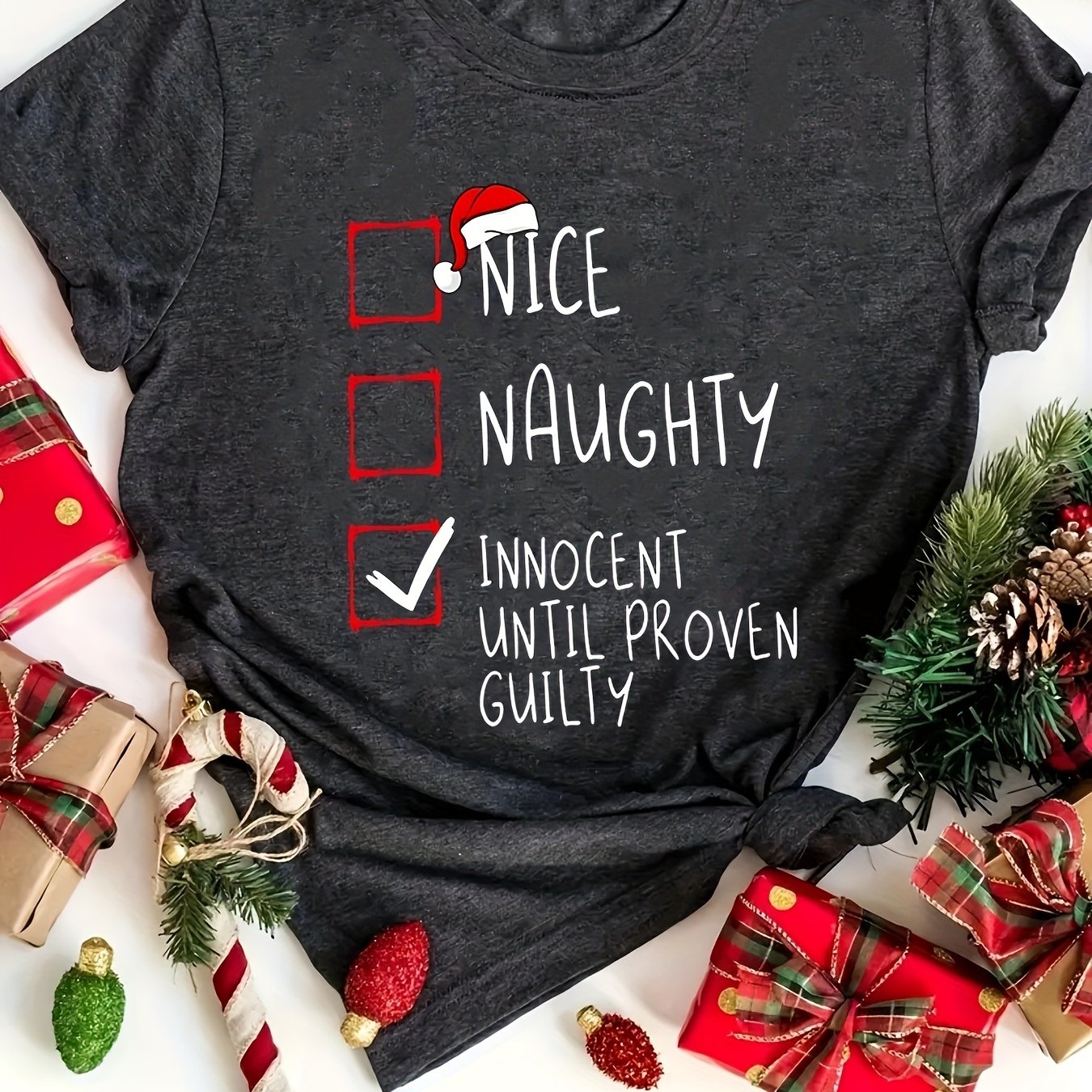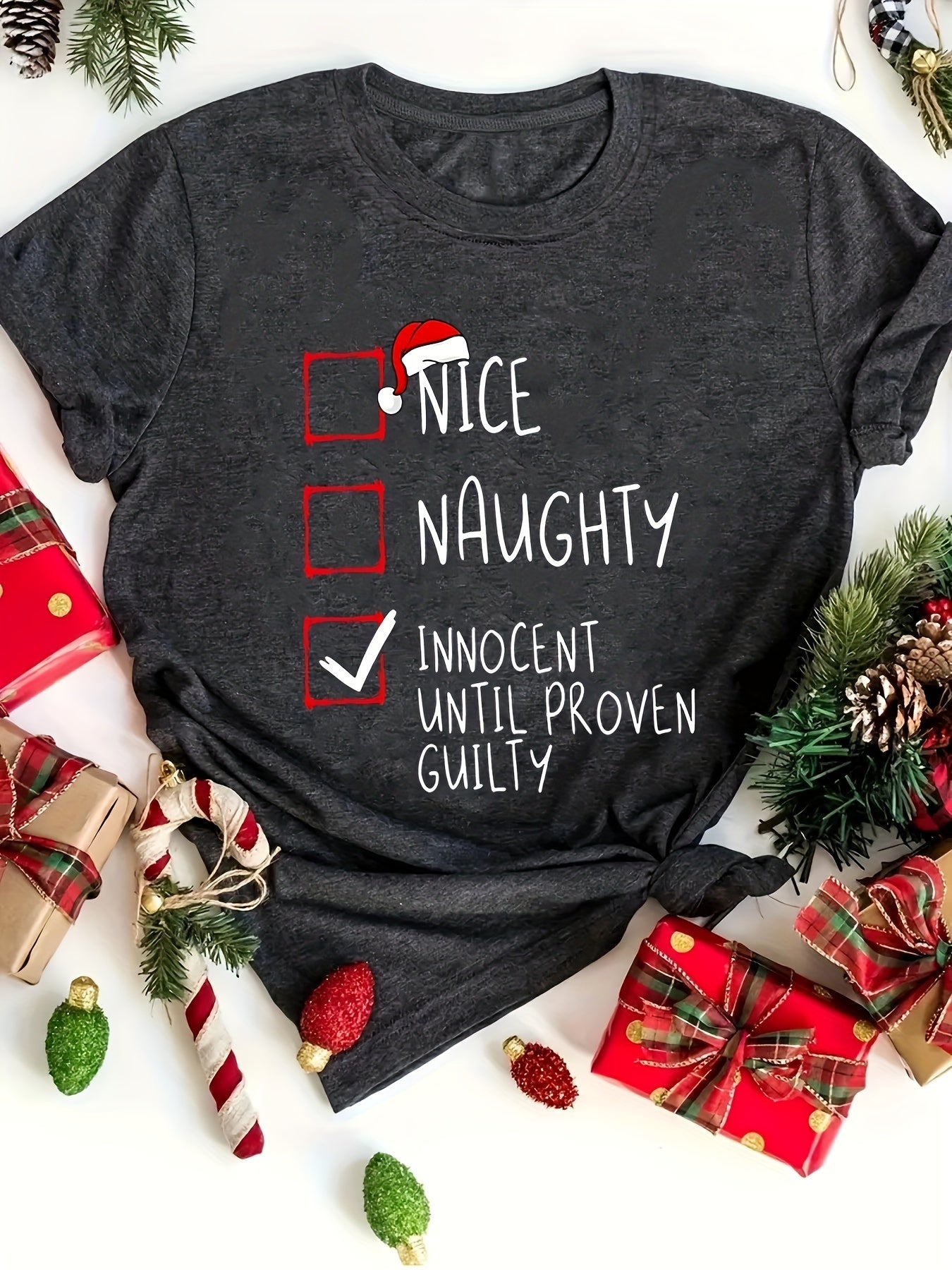 T-Shirt mit kurzen Ärmeln Dunkelgrau für Damen - Weihnachtslisten-Grafikdruck und Rundhalsausschnitt
